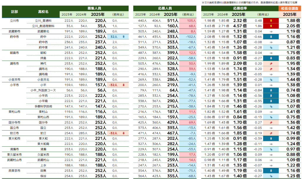 また、神代・狛江・国分寺などの人気校も安定した志願状況を維持しています。一方で、府中・小平南など一部の学校では志願者が大きく減少し、地域内での学校選択に明確な志向の違いが見られます。校長会調査でも立川創造理数科(2.05倍)、神代(1.95倍)が高水準である一方、1.0倍前後の学校も多く、学校間での差が顕著になっています。
