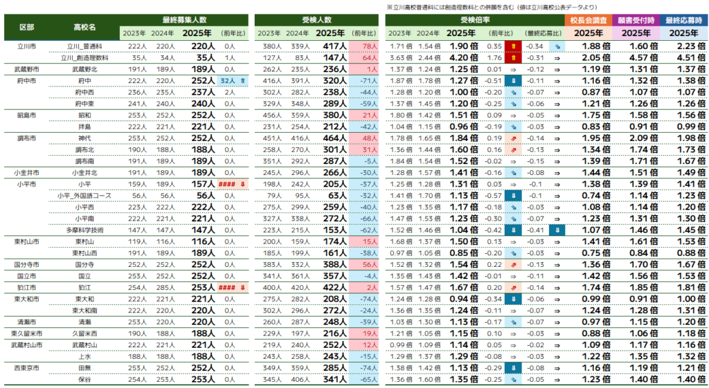 多摩地区北部の都立高校では、立川_創造理数科(4.20倍)や神代高校(1.84倍)、狛江高校(1.67倍)、昭和高校(1.51倍)、調布北高校(1.60倍)、国分寺高校(1.54倍)など一部の人気校を除き、多くの学校で前年と比較して受検倍率が下がる傾向が見られます。また、府中西高校(1.00倍)、多摩科学技術高校(1.04倍)、東大和高校(0.94倍)、拝島高校(0.93倍)、東村山西高校(0.85倍)などでは倍率が1倍前後まで下がっており、募集人数の充足が懸念される状況です。