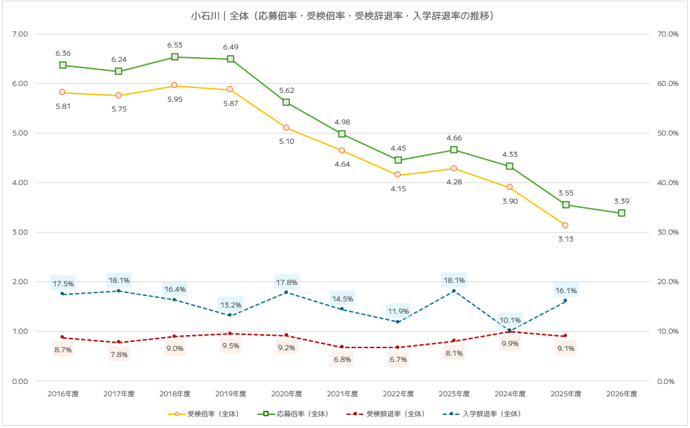 小石川の受検辞退率は6.7%~9.9%(都立10校平均4.1%~5.1%)、入学辞退率は10.1%~18.1%(都立10校平均5.1%~6.9%)で推移しており、いずれも都立平均の約2倍の水準です。