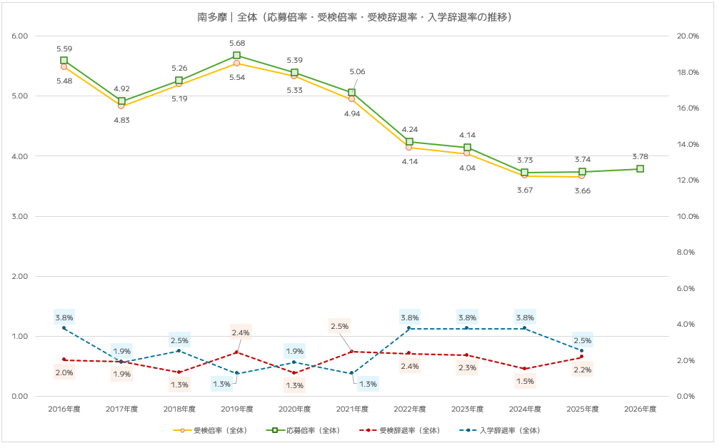 南多摩は都立中高一貫校全体の平均とほぼ同水準で推移しており、安定した人気を保っています。