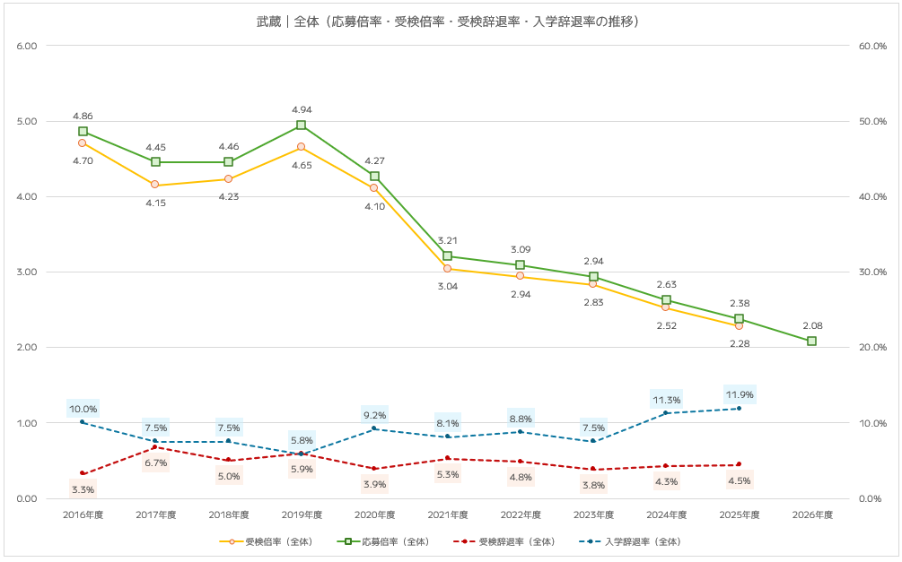都立中高一貫校10校全体の平均と比較すると、武蔵は都立平均よりも低い倍率で推移しており、近年は受験しやすい状況となっています。入学辞退率は11.9%とやや高めですが、これは私立中学との併願による影響と考えられます。
