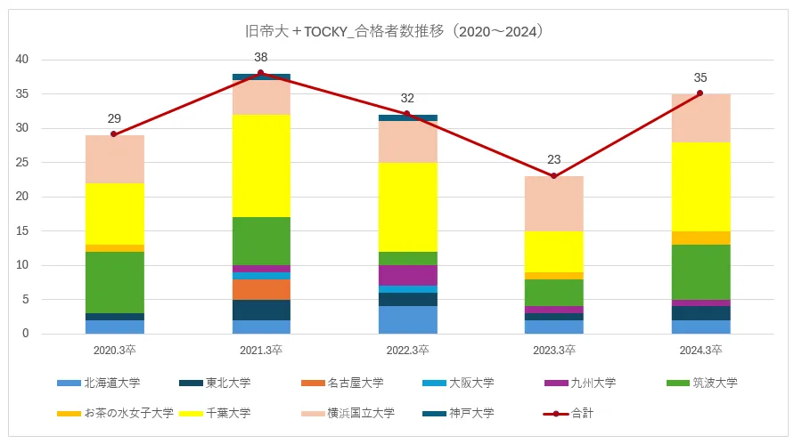2020・2021年度は2名ずつでしたが、2022年度に4名と増加し、その後2~3名で推移しています。旧帝大の中では比較的安定した合格者数を維持しています。 - 東北大学