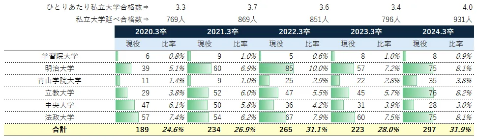 - 2024年度:私立大学延べ合格者数931人(1人あたり3.98校)