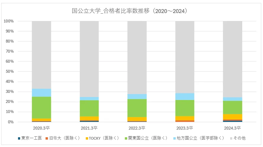筑波大学が最も多く4人の合格者を輩出し、前年度から2人増加しています。千葉大学も3人の合格者があります。一方で、横浜国立大学は前年度から3人減少し、神戸大学への合格者もありませんでした。全体として前年度より3人減少しており、やや減少傾向にあります。