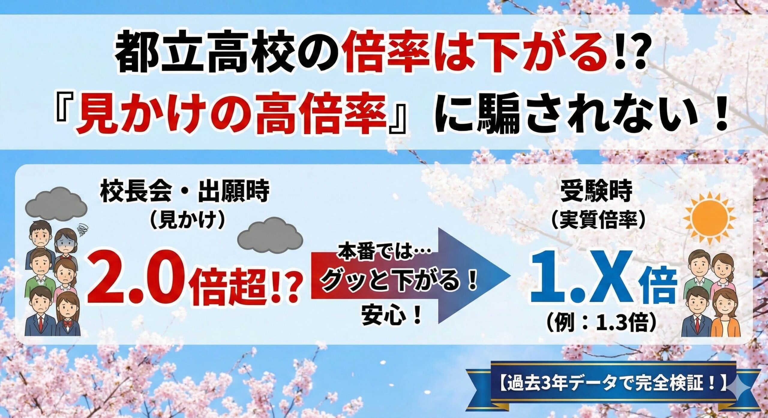 この記事では、過去3年間のデータを徹底分析し、「見かけの倍率」がいかにして「実質倍率(=本当のライバル数)」まで下がるのかを、エリア別・学校別に完全可視化しました。「2倍」という数字のオバケに騙されず、本当の勝負の姿を見極めてください。